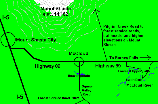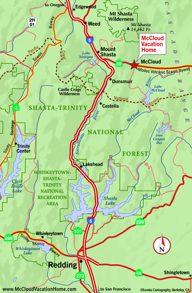 Exit I5 north or south at the McCloud exit. The exit is about 60 miles north of Redding, and 60 miles south of the Oregon State line.